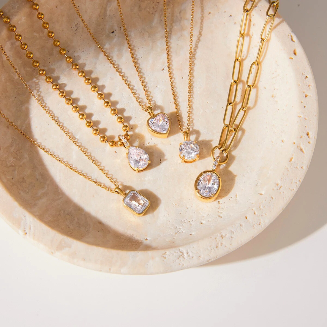 Elegant pendant necklace made of high-quality gold-plated stainless steel. A waterproof and hypoallergenic piece featuring a luminous solitaire pendant.