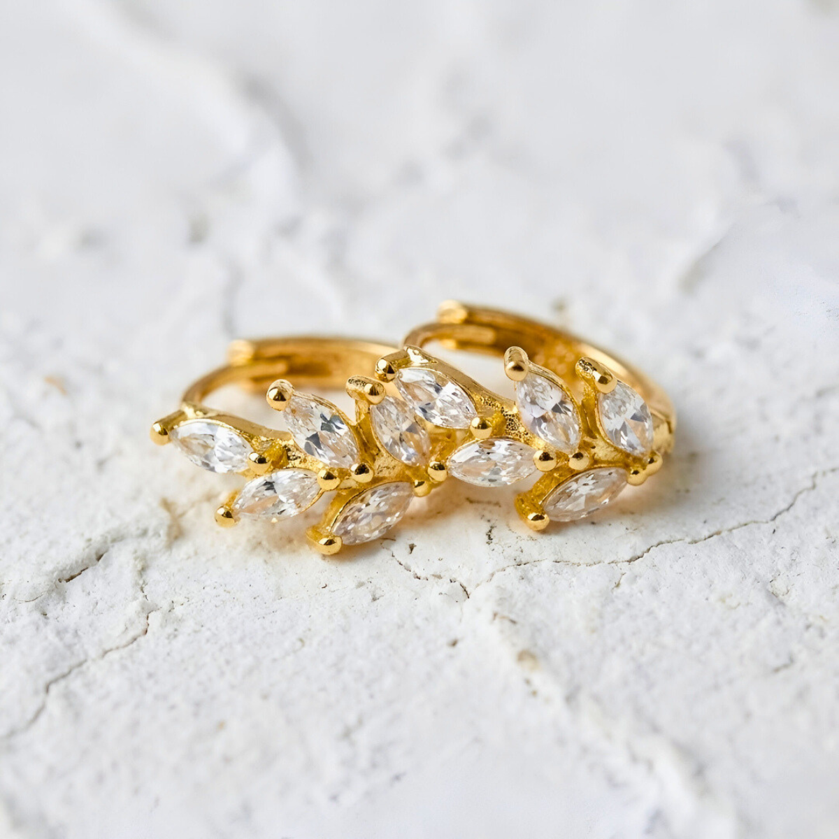 Elegant hoop earrings with a botanical motif, featuring marquise-cut zirconia arranged like delicate gold leaves.