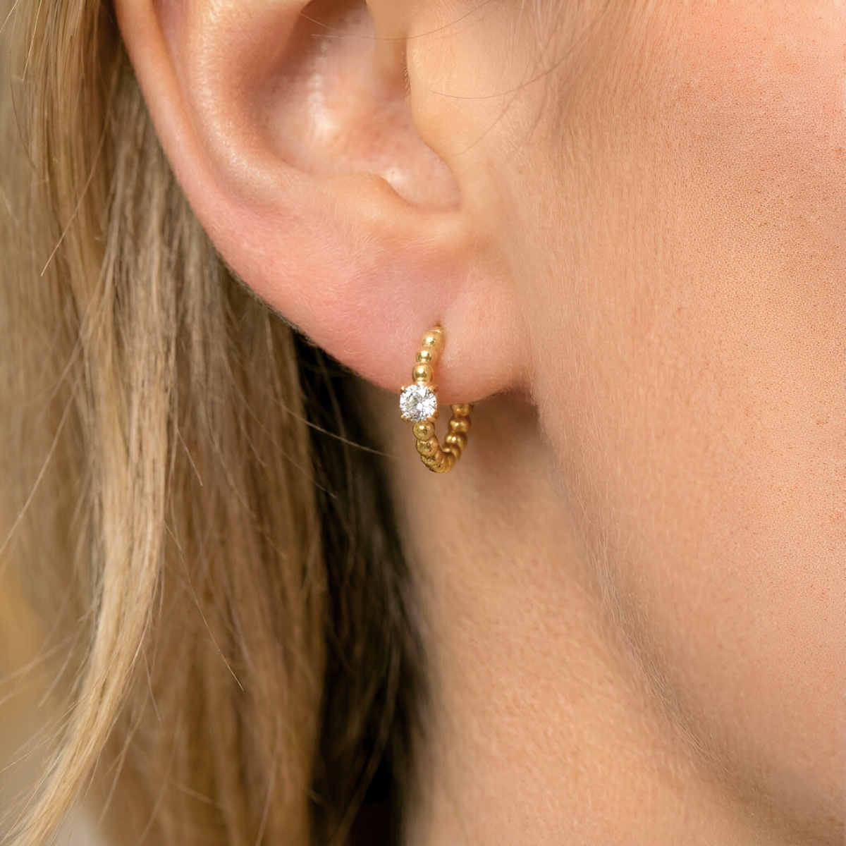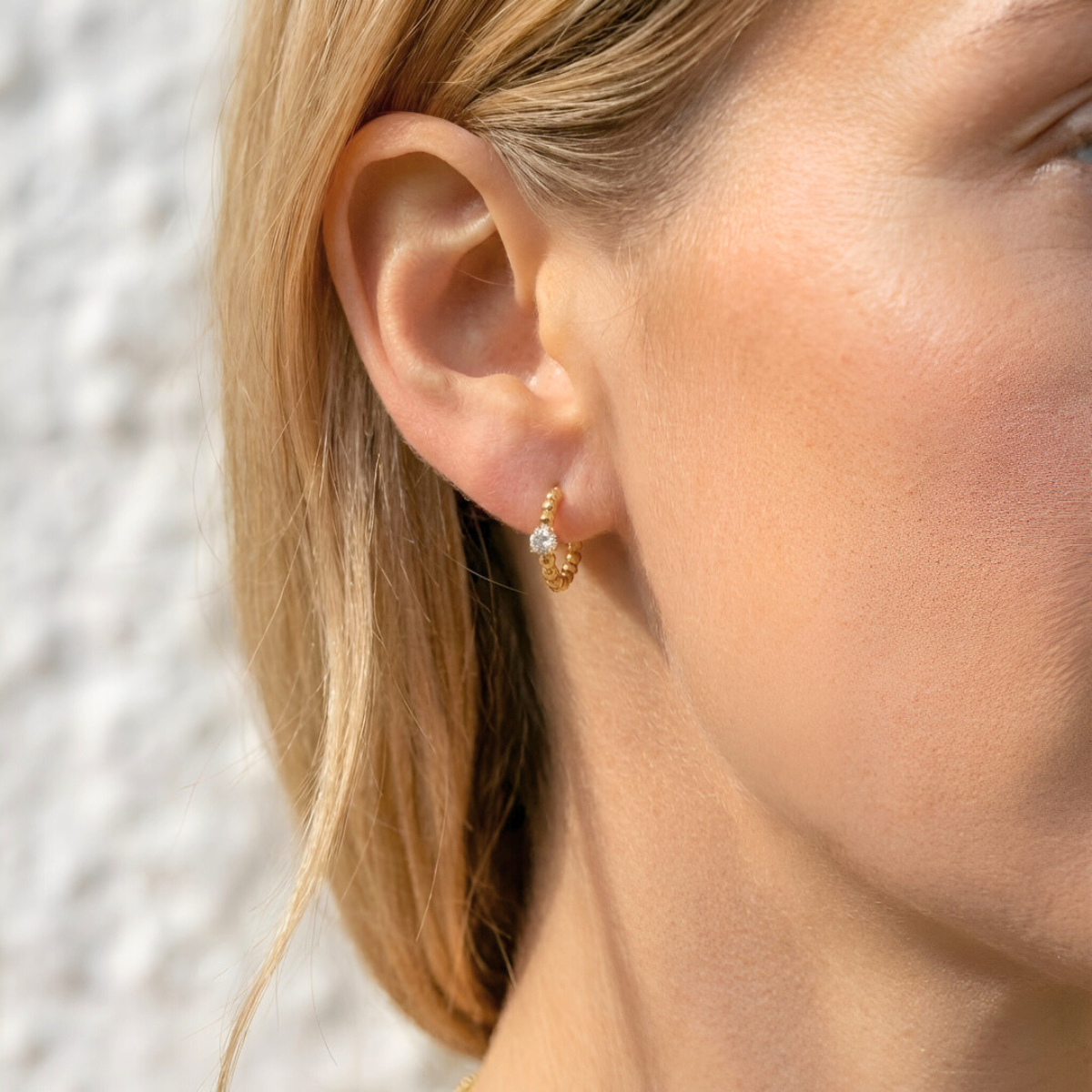 These gold-tone earrings delicately wrap around the earlobe for a subtle yet striking elegance. At the center, a sparkling zirconia stone captures the eye, adding a touch of timeless class.