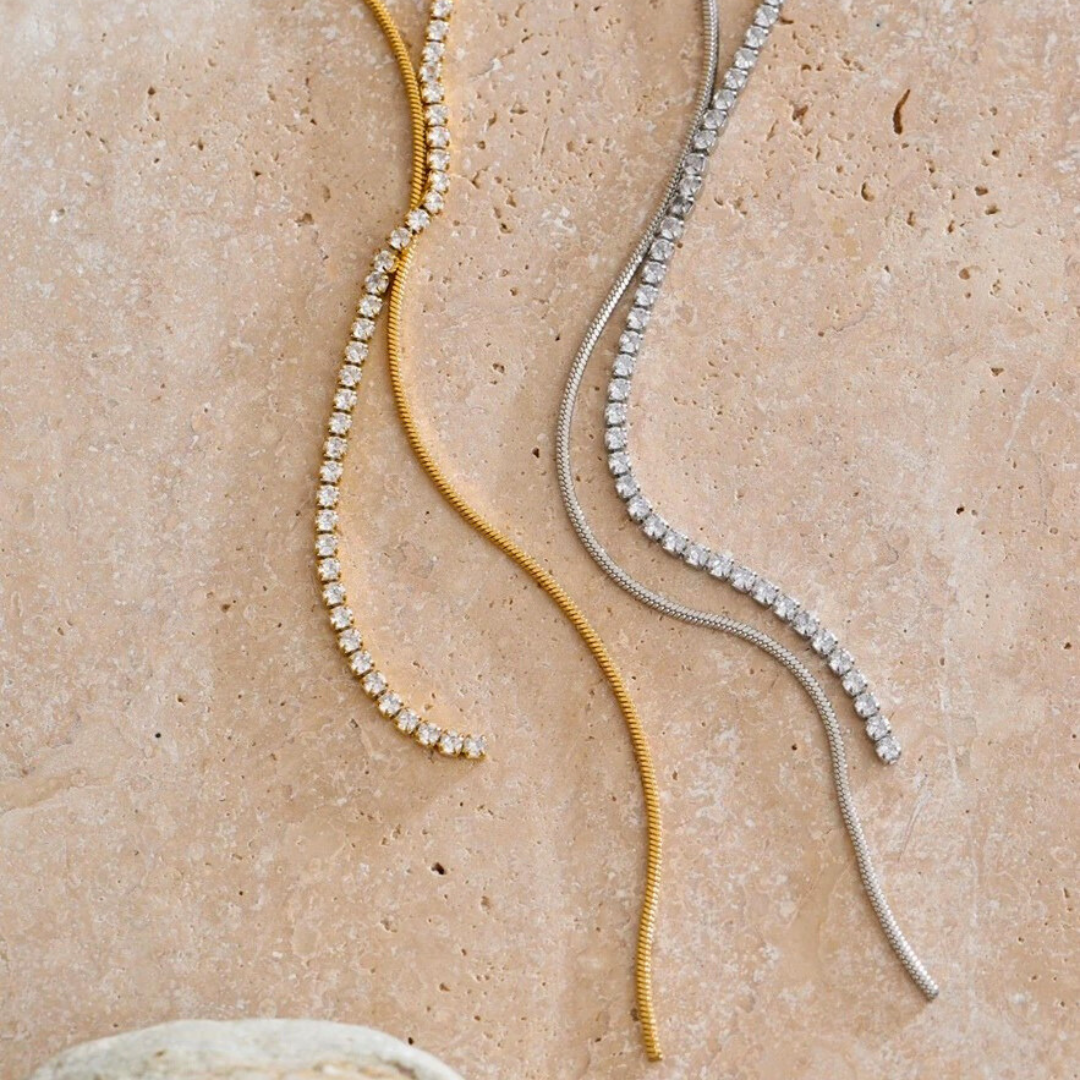 An elegant double-strand necklace that combines the fluidity of a chain with the timeless brilliance of tennis crystals.