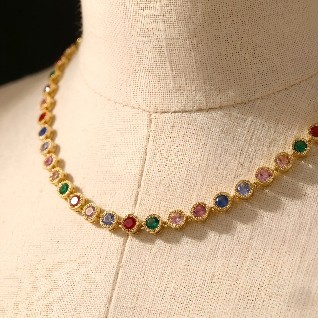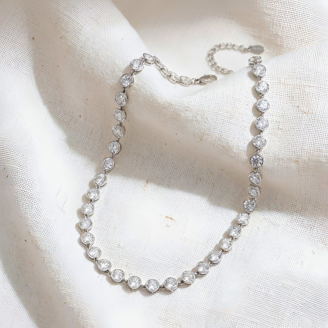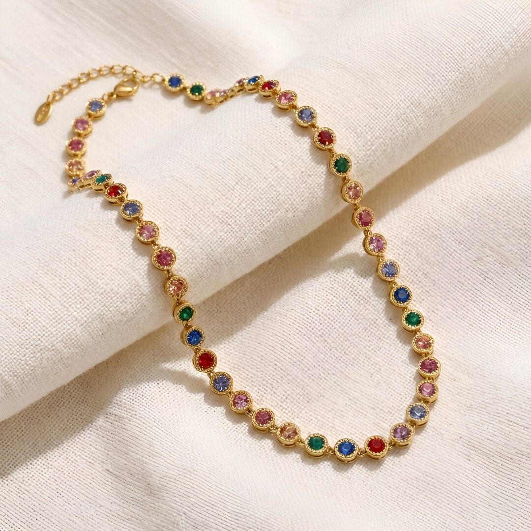 Illuminate your décolleté with this refined tennis necklace, a timeless classic reimagined with a modern twist. Crafted with a durable setting and brilliant-cut crystals, it's available in silver and gold, with classic white or multicolored rainbow stones.