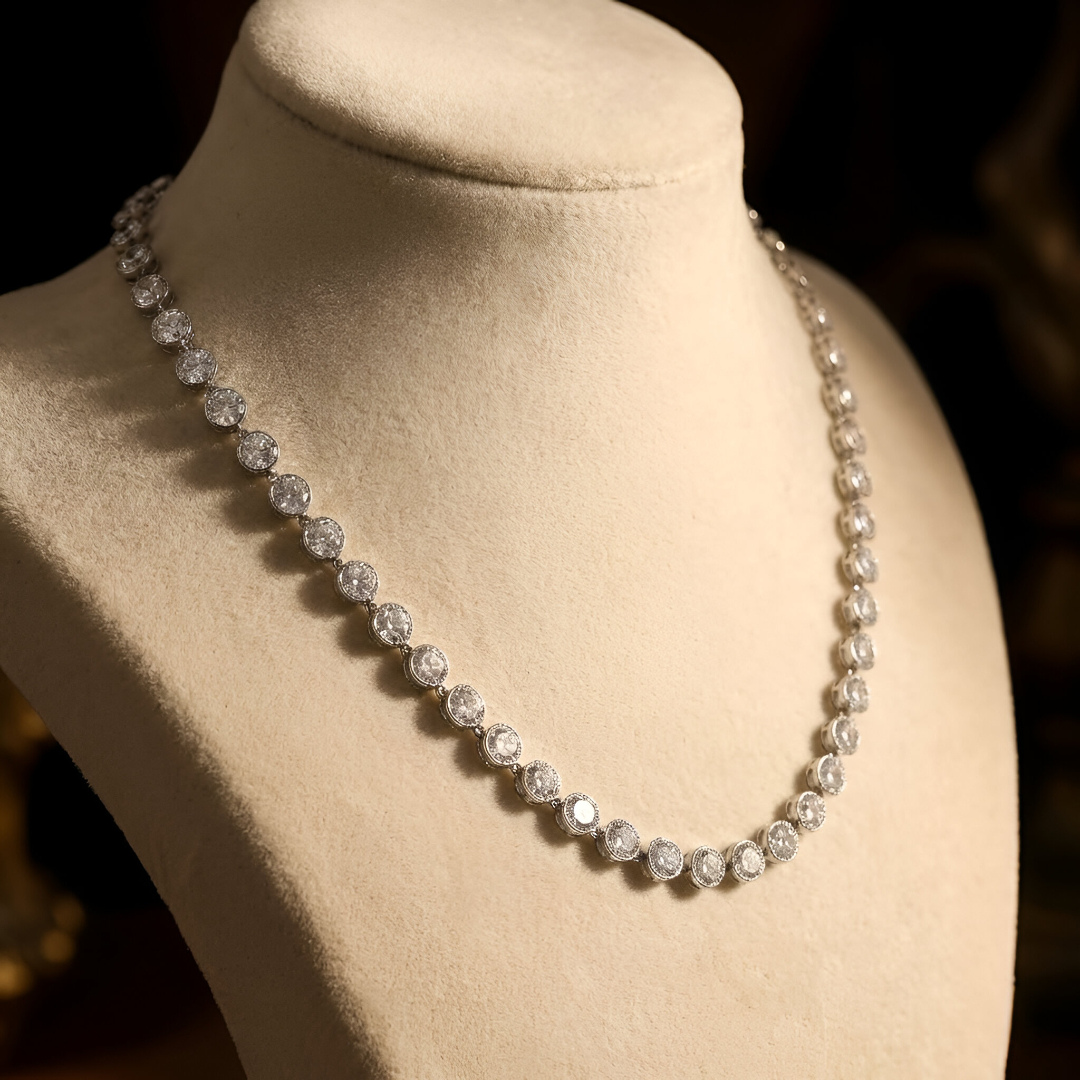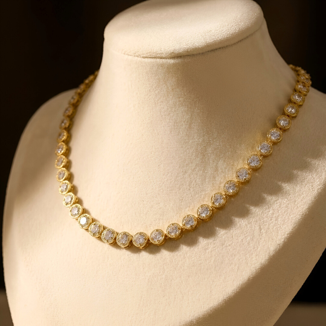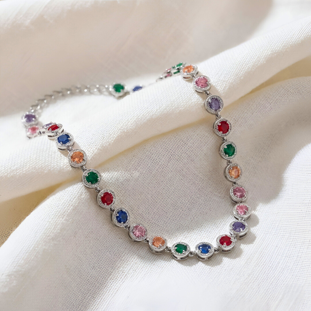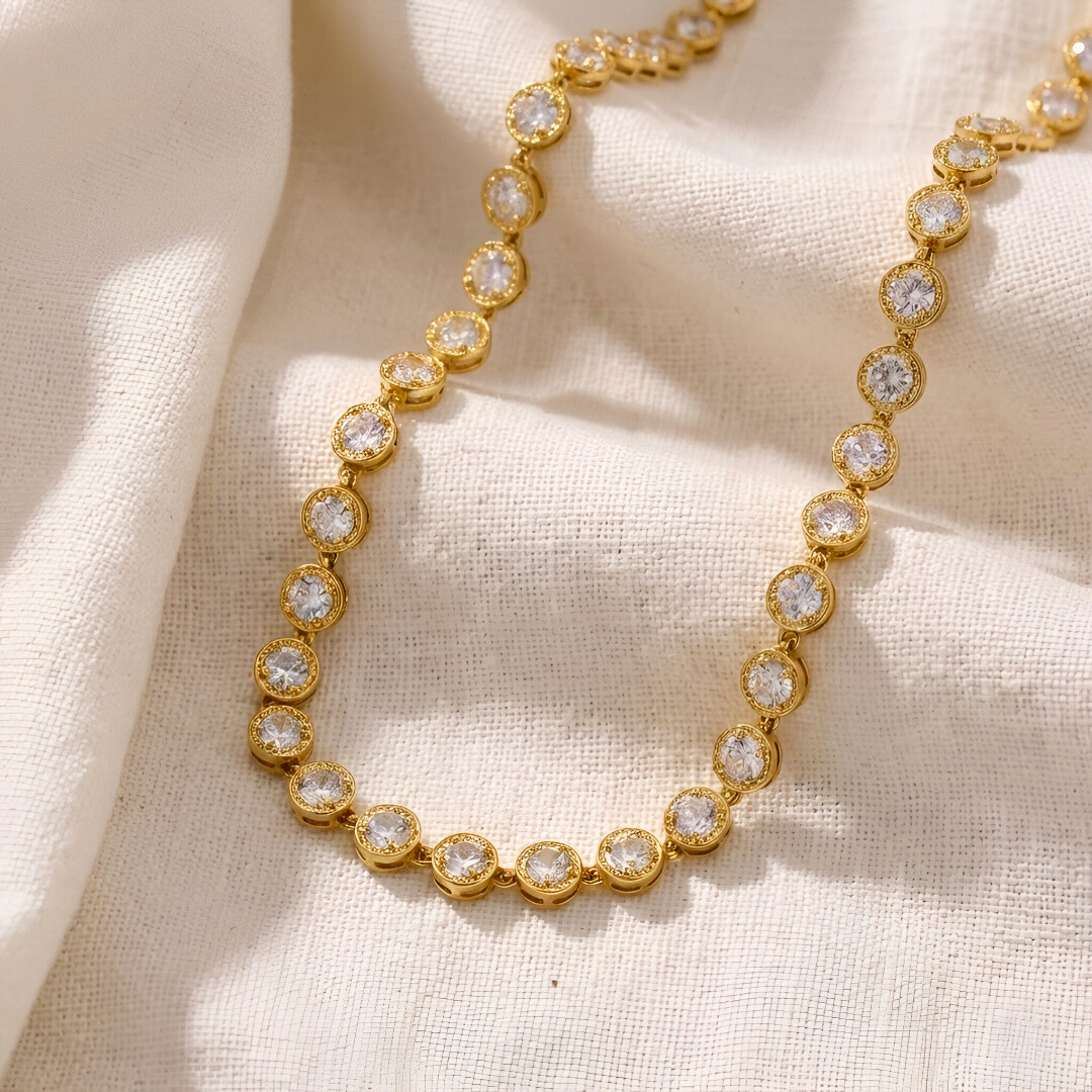 Illuminate your décolleté with this refined tennis necklace, a timeless classic reimagined with a modern twist. Crafted with a durable setting and brilliant-cut crystals, it's available in silver and gold, with classic white or multicolored rainbow stones.