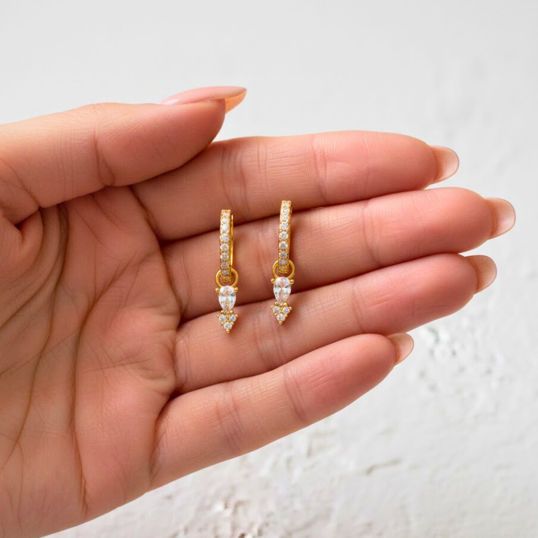 The design combines a pavé-studded zirconia hoop with an elegant teardrop pendant that catches the light with every move.