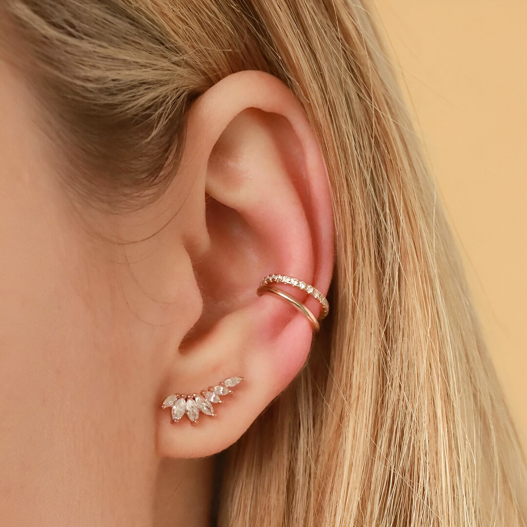Featuring a trail of marquise-cut zirconia set on a gold base, they create an elegant "wing" effect that delicately hugs the profile of the ear.