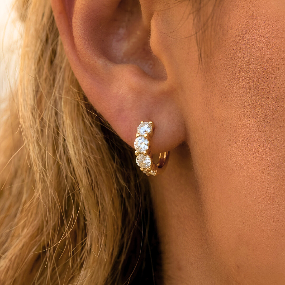 Featuring an elegant Trilogy design, they feature three bright zirconia stones set in a gold base that delicately wraps around the earlobe.
